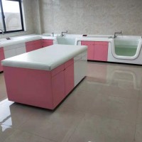 婴儿洗浴中心由婴儿洗礼池,婴儿游泳池,护理平台,抚触软包台,洗手池等组成。洗礼池和游泳池,洗手池,护理平台,转角平台都采用面层为A级PMMA高分子复合材料一体成型,表面细菌残留量远远低于不锈钢,人造石,陶瓷盆和其他普通塑料。婴儿洗澡池底部圆滑突起设计;给婴儿一防滑支撑点,防止婴儿在池内滑动,造成意外呛水。